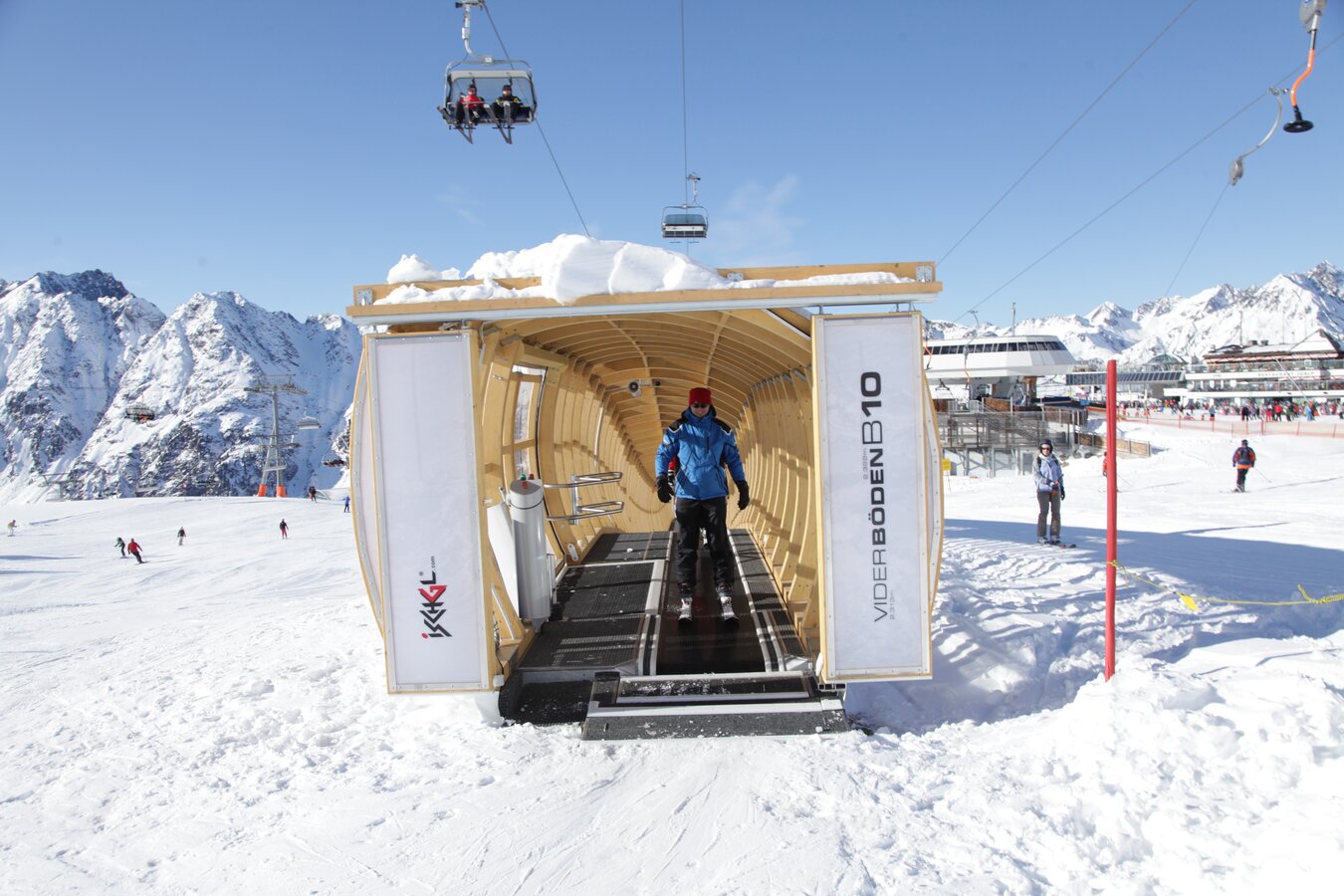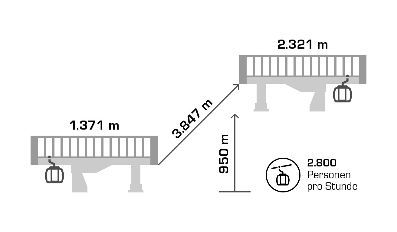 Its 24-passenger bicable ropeway design (funitel system) facilitates safe operation even at wind speeds of 100 km/h. 63 gondolas run from Ischgl to Idalp with a maximum line speed of up to 6 m/s.
