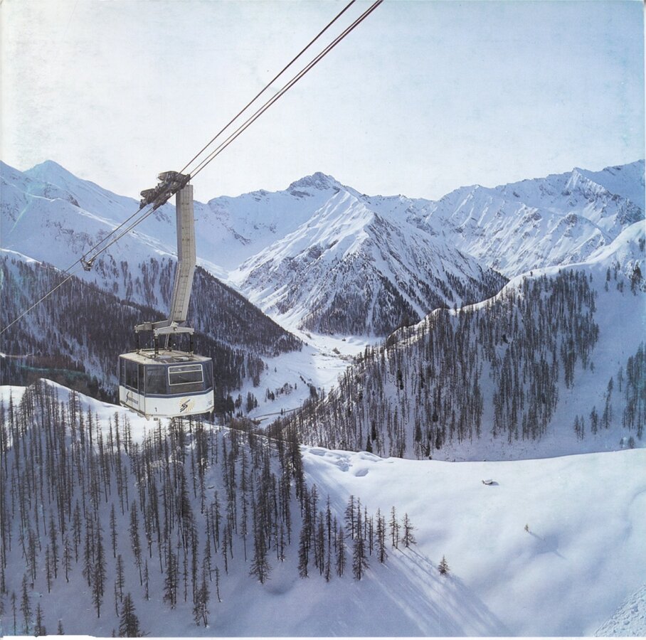 The Twinliner in Samnaun is one of the largest aerial cable cars in the Alps, featuring two double-decker gondolas with a total capacity of 180 passengers, with 110 passengers traveling in the upper and 70 passengers traveling in the lower gondola. The cableway runs with a max. ground clearance of 210 m over 3 pillars from Samnaun to Alp Trider Sattel. Built in 1995, the aerial cableway has a vertical rise of 722 m, a route distance of 2.300 m and a total capacity of 1.620 persons/hour. Maximum speed is 10 m/s, rope diameter is 64mm.