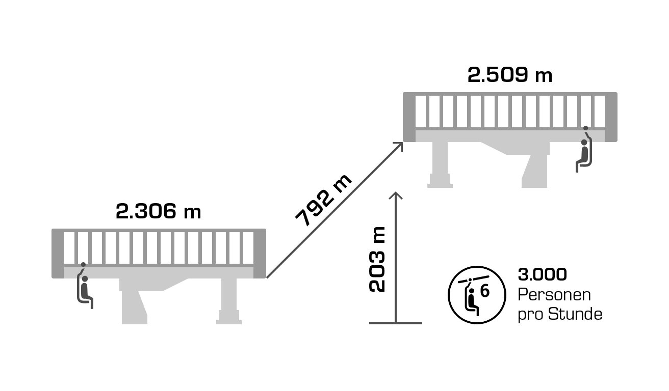 Built in 2000, the detachable chair lift has weather protection bubbles, a total capacity of 2.800 persons per hour and 60 six-person chairs, which travel 1.050 m over 10 pillars up to the mountain station.